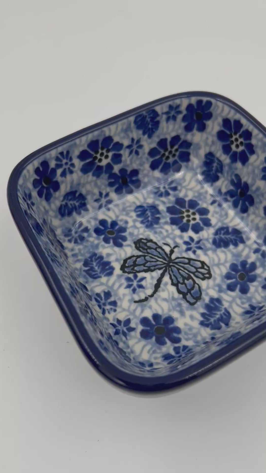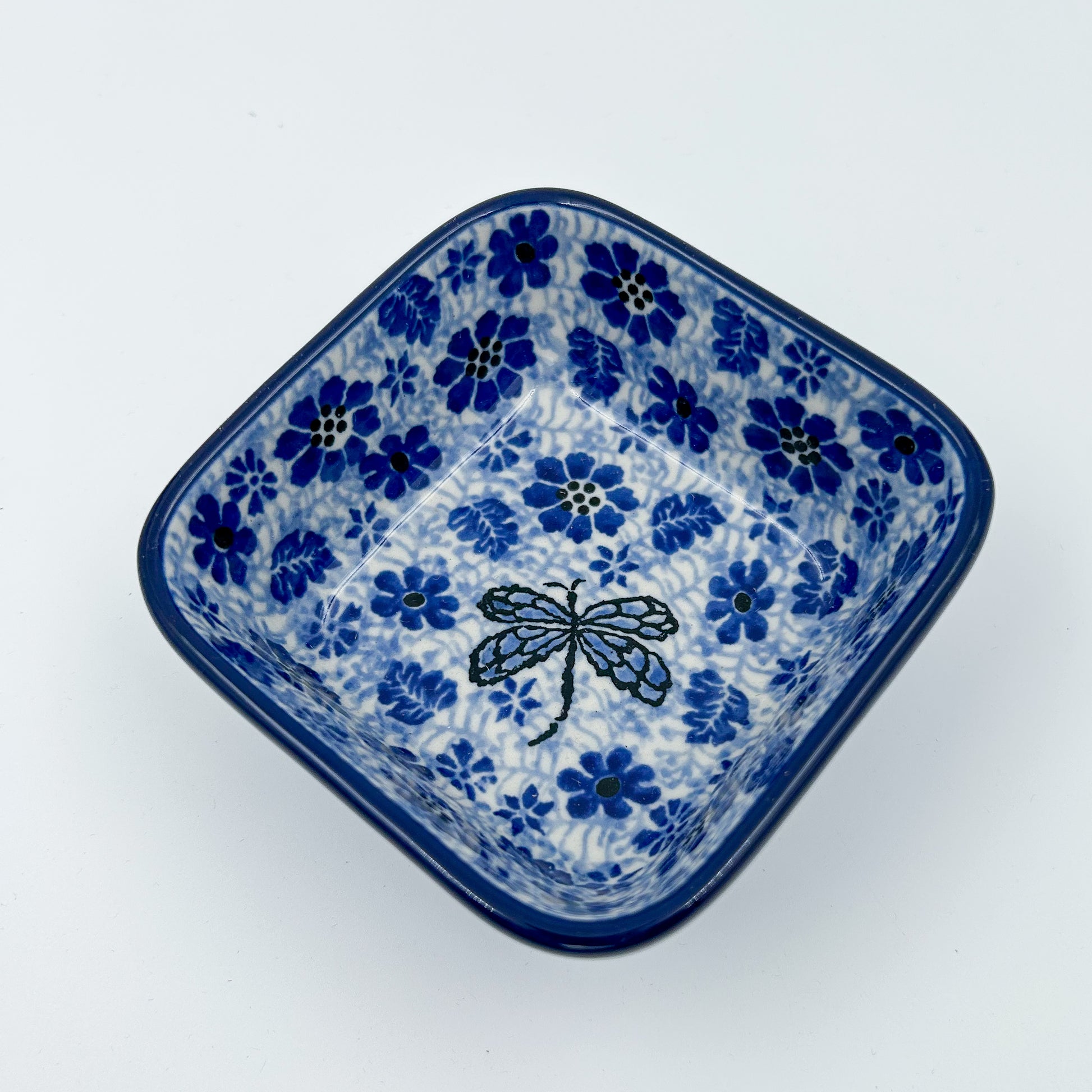 Polish pottery 4” square bowl in the UNIKAT Misty Dragonfly pattern. This Polish Pottery bowl is made by talented artisans from Poland.
