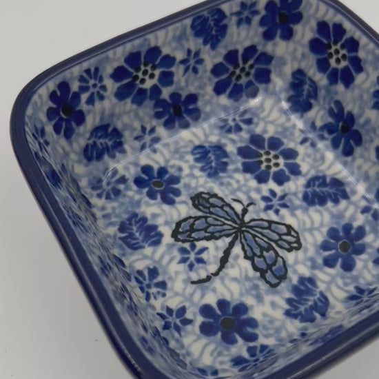 4” Square Bowl. Hand crafted Polish pottery stoneware: Misty Dragonfly Design.