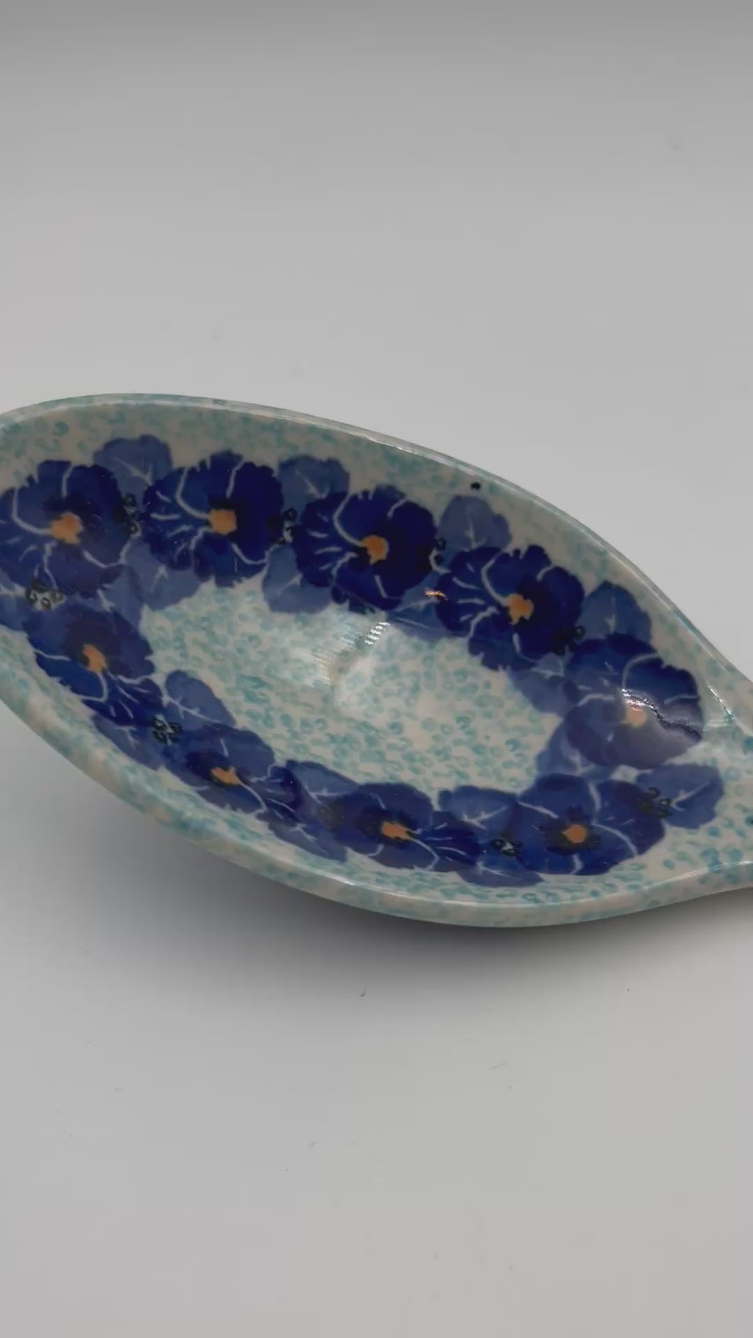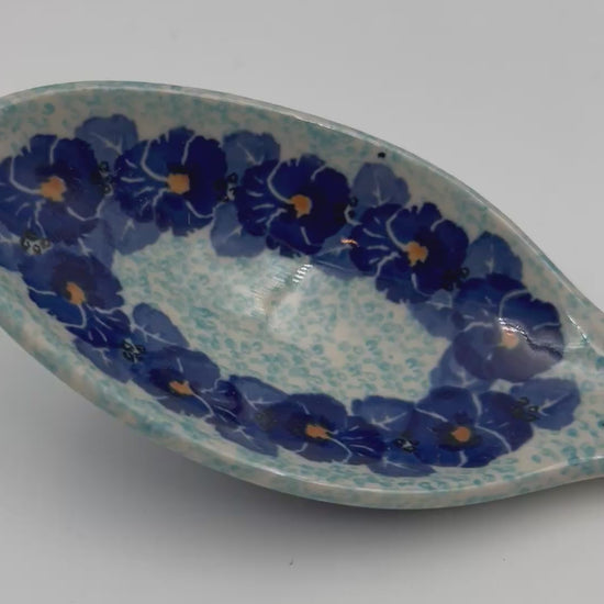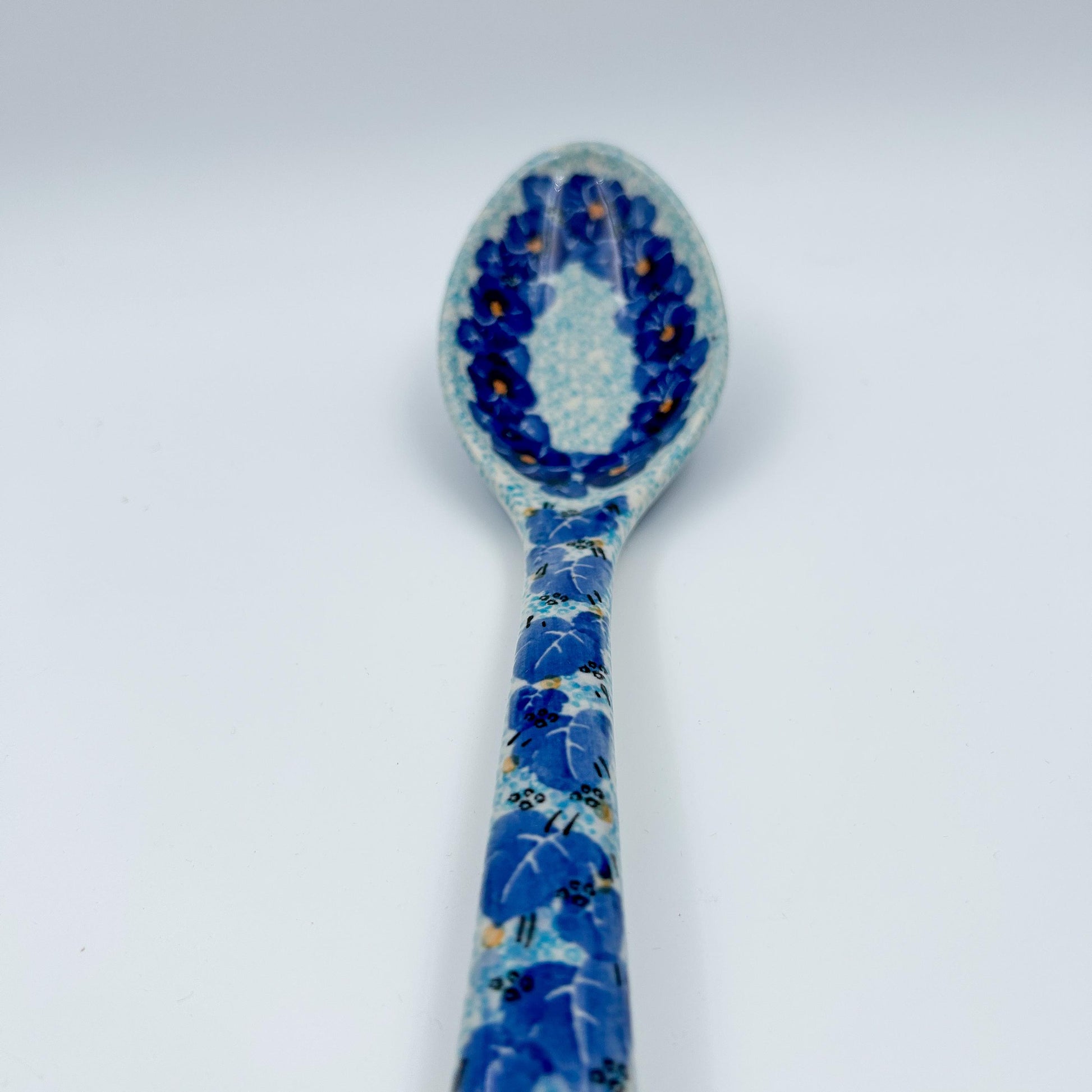 This 13” spoon is a handmade by talented Polish artisans. This is a Polish UNIKAT Deep Winter pattern signature spoon, which means it has been hand painted with both sponges and brushes and is signed by the artist who painted it.